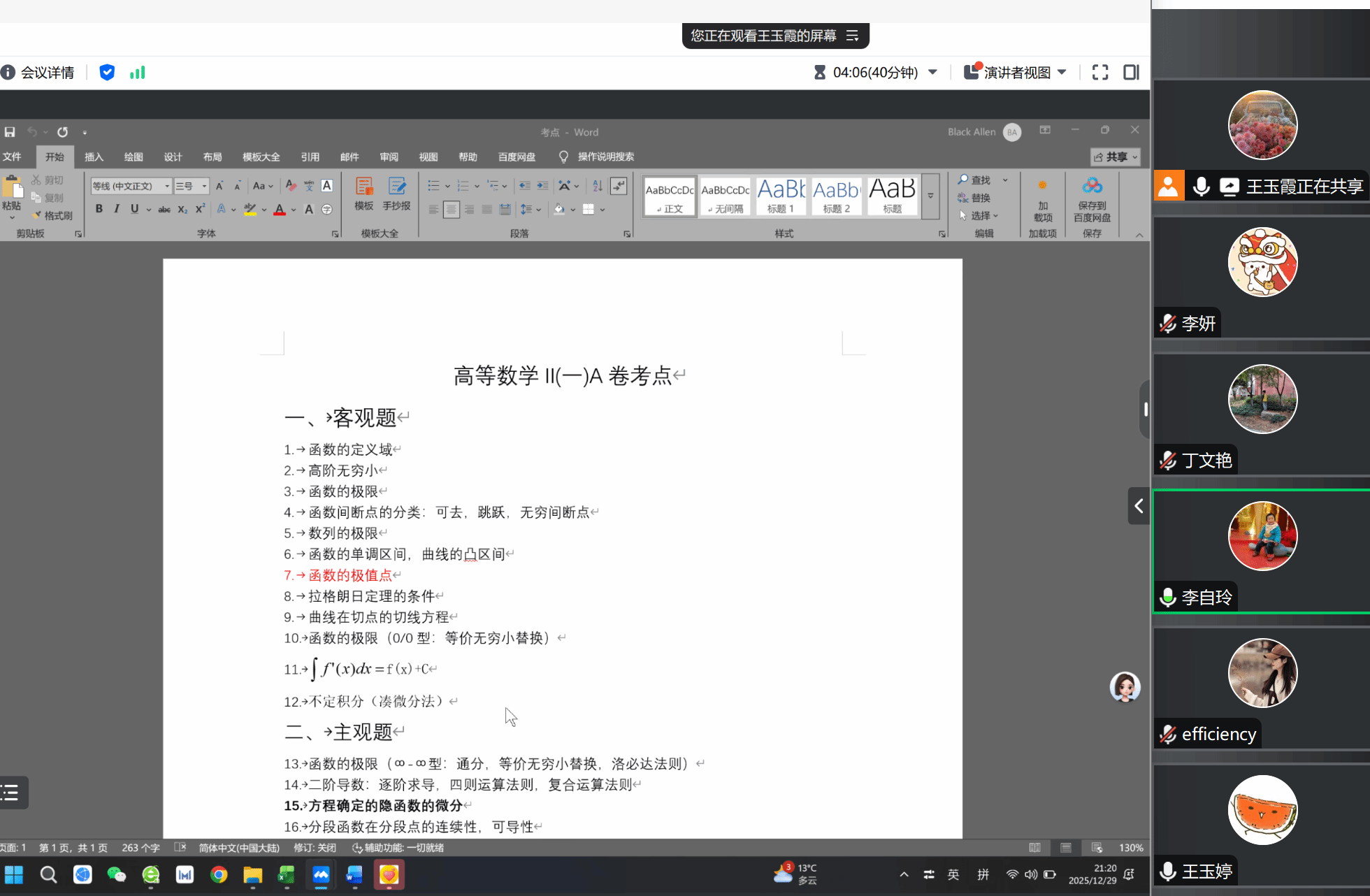 为切实做好期末考前教学保障工作,帮助学生精准把握复习重点,确保期末考核的平稳有序开展,12月29日晚八点,数理课部高数课程组以腾讯会议形式召开考前期末研讨会。会议由数理课部主任王玉霞主持,全体课程组成员共同参与,围绕考前考点梳理、试卷最终确认及考前答疑布置等核心任务展开深入研讨,为期末冲刺阶段的教学工作明确方向。