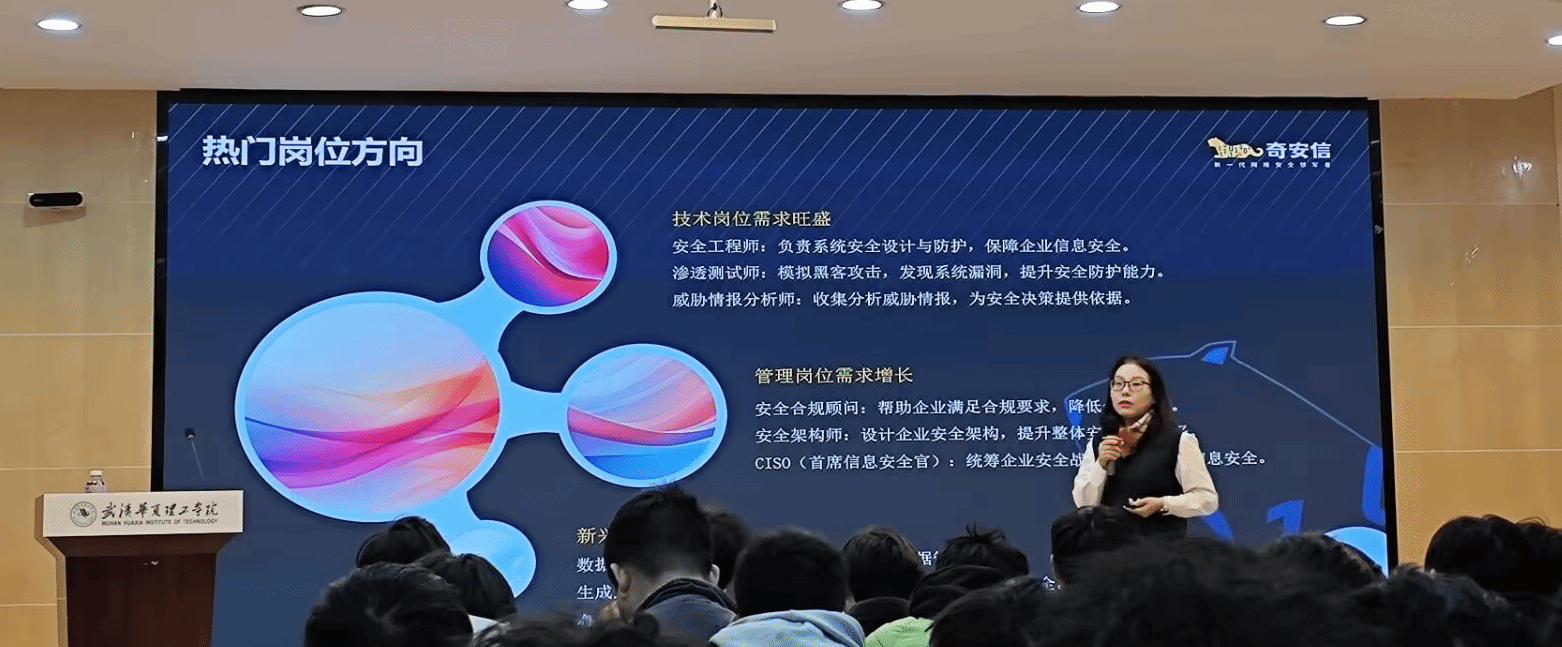 宣讲中,闫总结合当前数字化发展趋势,指出网络安全已成为国家战略与企业发展的重要基石。他详细阐述了计算机专业学生在网络安全领域的独特优势,尤其是在系统架构理解、网络协议分析、安全设备运维等方面的扎实基础,并对应介绍了安全运维工程师、应急响应工程师等岗位的真实工作场景与技术发展路径。