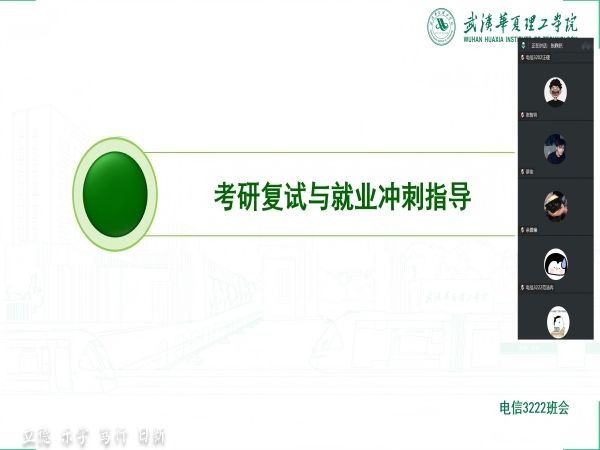 为帮助毕业班学生科学应对考研复试、全力推进就业进程,2026年3月27日中午12:40,电信3222班通过腾讯会议召开了主题为“考研复试和就业冲刺指导”的线上班会。本次会议由班主任张静舒老师主持,全体同学参加。