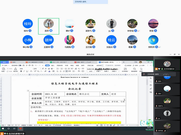8月18日下午,电子与通信工程系在腾讯会议召开线上暑期研讨会。会议由赵京主任主持,参会人员有深入系部指导工作的两位校领导和参与调研的全体教师,会议主要围绕暑期调研成果展开讨论,并进行开学工作部署。