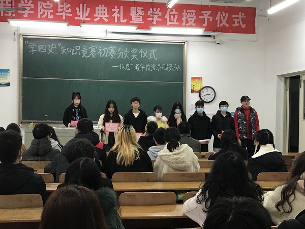 此次颁奖仪式在信息工程学院党员服务站陈远扬站长的带领下顺利进行。首先主持人杨晓燕宣布在此次知识竞赛中获得优秀奖、一等奖、二等奖、三等奖的同学名单。一等奖:甘天游,程珂佳,庞梦洁。二等奖:易俊玲,徐州,刘思成,孙至炜,余梦情,姜巧玲。三等奖:王伟杰,何聪,谭春艳,熊智慧,施文,李宗儒,张梓正,虞礼帅,卢德民。优秀奖:戴丽莎,杨子润,刘攀,申明鑫。我们向所有的获奖同学表示祝贺。陈远扬站长给获得优秀奖和一等奖的同学颁发奖状,陈莹同学给获得二等奖的同学颁发奖状,廖永琪同学给获得三等奖的同学颁发奖状。最后陈远扬站长鼓励获奖同学更加努力地学习好党史、新中国史、改革开放史、社会主义发展史。争取在学校的知识竞赛决赛中勇获佳绩,为自己和学院争光。