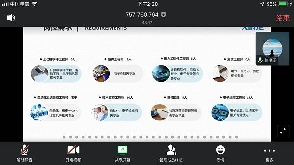 人力资源部王经理介绍了企业的发展历程、岗位需求、人才梯队、薪资待遇、应聘流程。公司是一家主要从事工业自动化产品的研发与应用的国内主板上市企业,在疫情期间,业务实现爆发式增长;参加招聘会的信息学院学生就工作岗位具体情况、实习生的待遇等问题与企业进行了深度交流。程先亮老师对单位的发展前景表示高度认同,他号召全体同学走出疫情的阴霾,放下对地域的偏见,积极投递简历,给无锡一个机会、给信捷一个机会,更为重要地是给自己一个机会。