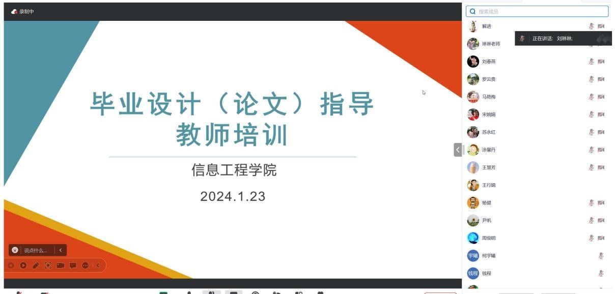 2023年1月23日中午12:30,信息工程学院使用腾讯会议,在线召开了“2024届毕业设计(论文)新指导老师培训会”。会议由教学副院长王绪梅主持,学院毕业设计负责人刘琳琳主讲,各专业新指导教师和结对教师均参与会议。
