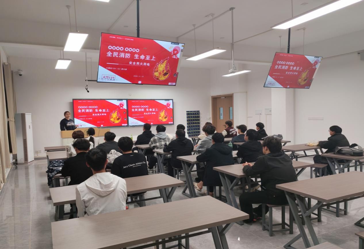 “以前总觉得火灾离自己很远",计算机1251班为了提高同学们的消防意识,11月26日晚,在教学楼B202开展了以“全民消防,生命至上”为主题的班会。通过详细的讲解消防问题来提高同学们对消防的了解。