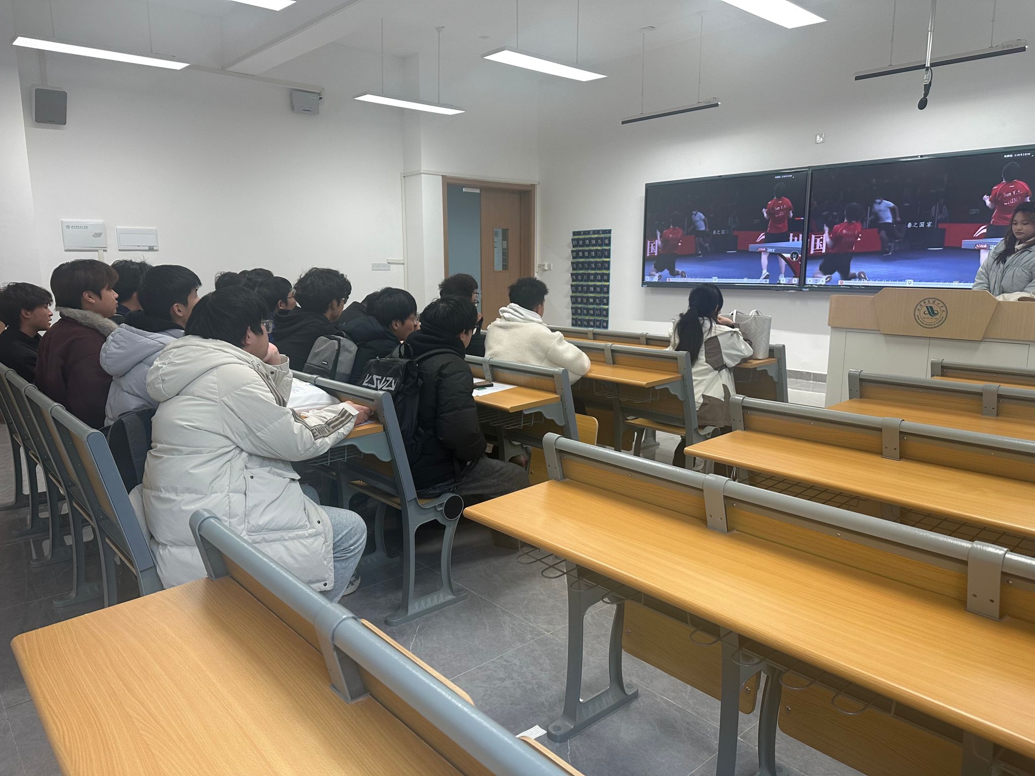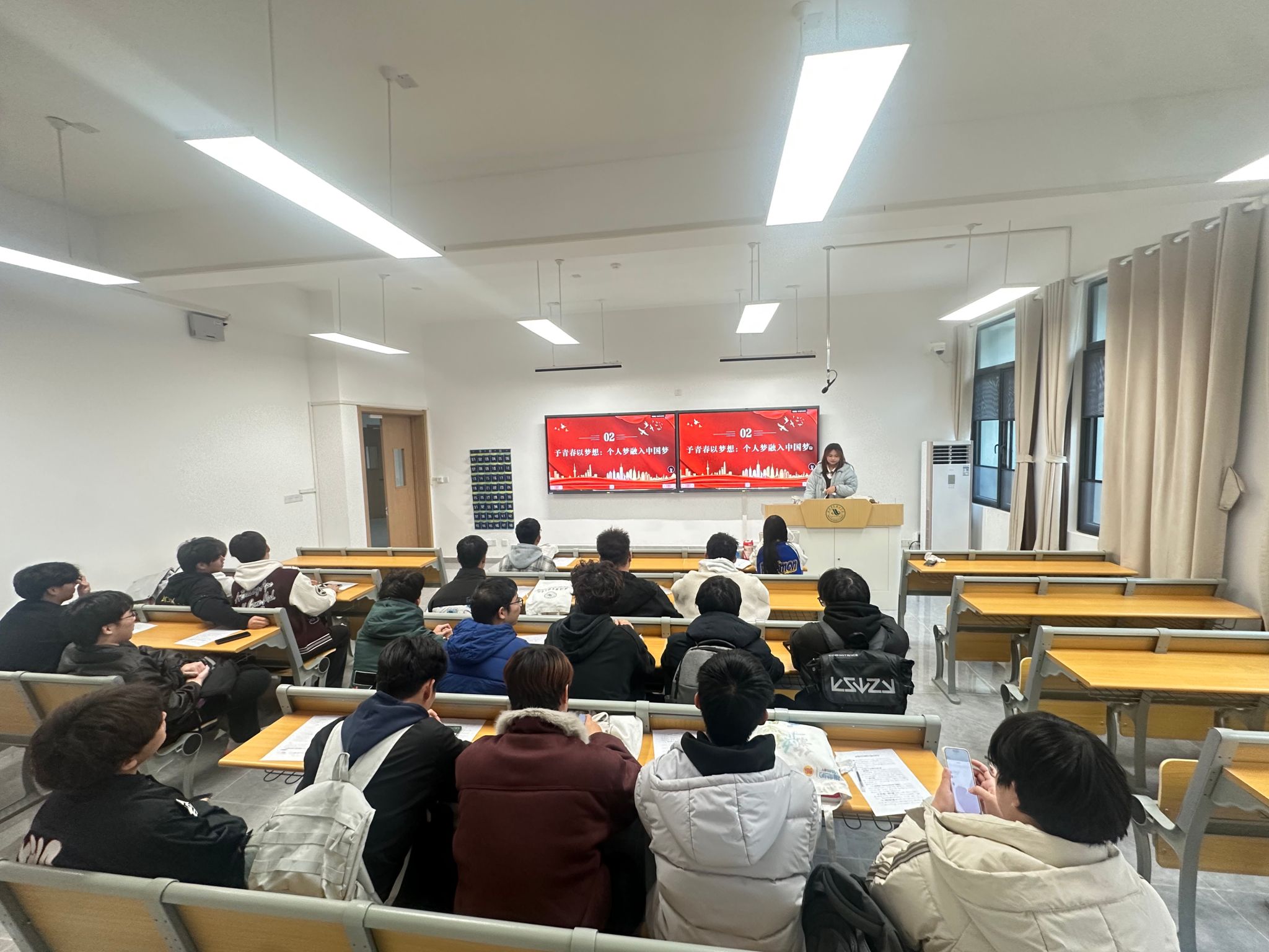 活动以“沉浸式学习+专业联结”为核心展开:团支书陈奕琛先通过PPT呈现了新中国成立76年来的“三个跨越”——从“站起来”的开国大典影像,到“富起来”的改革开放经济数据,再到“强起来”的航天、高铁等科技成果,搭配“两弹一星”元勋钱学森、脱贫攻坚模范黄文秀等人物的事迹短片,让同学们直观感受到家国发展的脉络;随后设置“红色故事我来讲”环节,班级中来自江西井冈山的同学分享了当地“红军挑粮小道”的当代保护与开发案例,结合环设专业的“文化遗产活化设计”知识点,引发了“如何用设计让红色资源‘活’起来”的讨论;视觉传达方向的同学现场展示了自己以“抗美援朝精神”为主题的海报草稿,讲解了“红旗元素+几何线条”的设计逻辑,其他同学则围绕“色彩感染力”“符号辨识度”提出优化建议,让交流从“思想感悟”延伸到“专业实践”。
