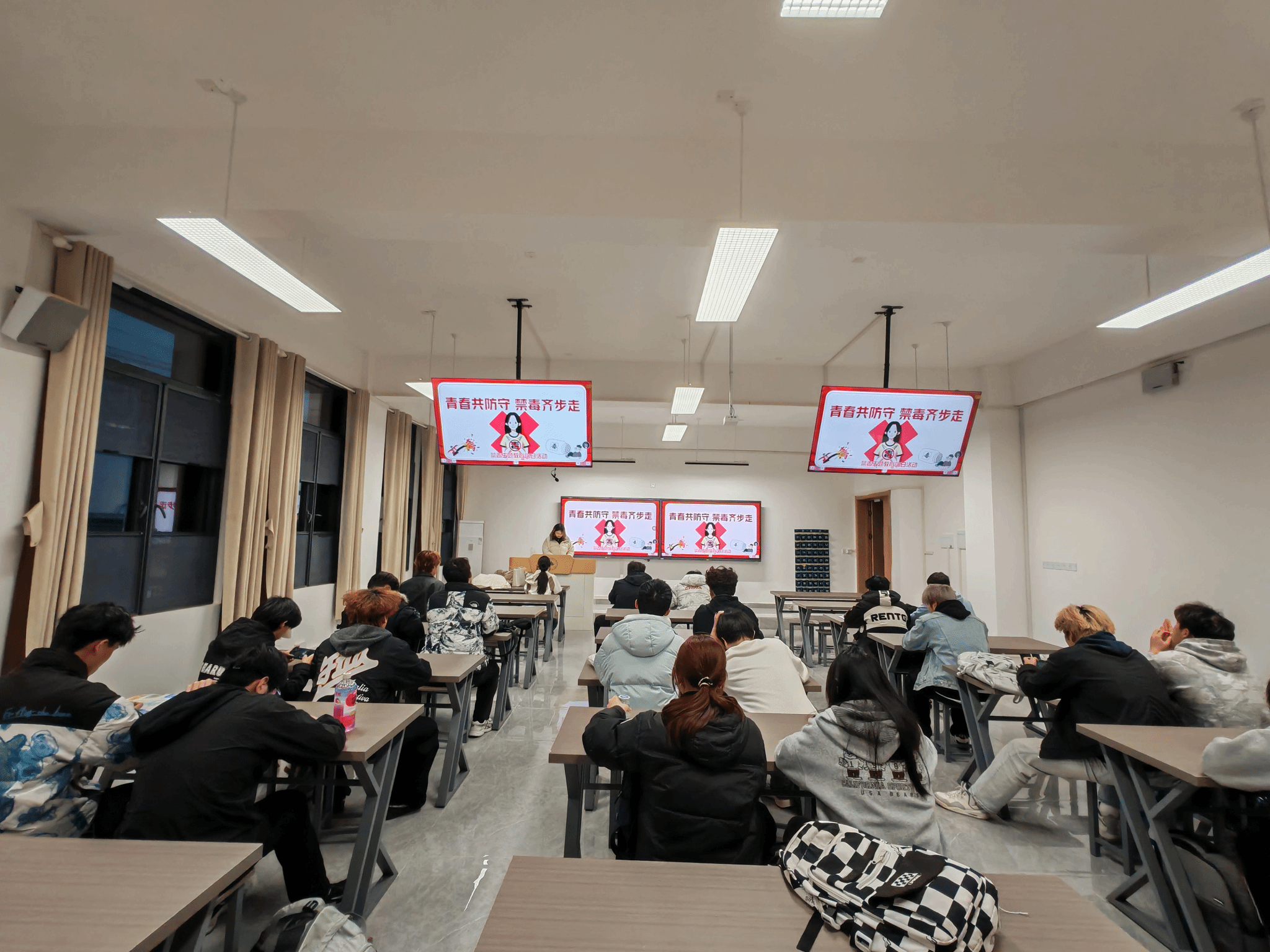 为深入贯彻落实国家禁毒工作部署,切实加强青少年毒品预防教育,提升青年学子识毒、防毒、拒毒的意识与能力,筑牢校园安全防线,3月12日,计算机1251团支部以“青春共防守 禁毒齐步走”为主题,开展校园禁毒宣传教育专题团日活动,团支书陈奕琛带领同学开展了一场深刻的禁毒警示教育。活动现场,浓厚的宣传氛围让学生们时刻感受禁毒工作的重要性与严肃性。