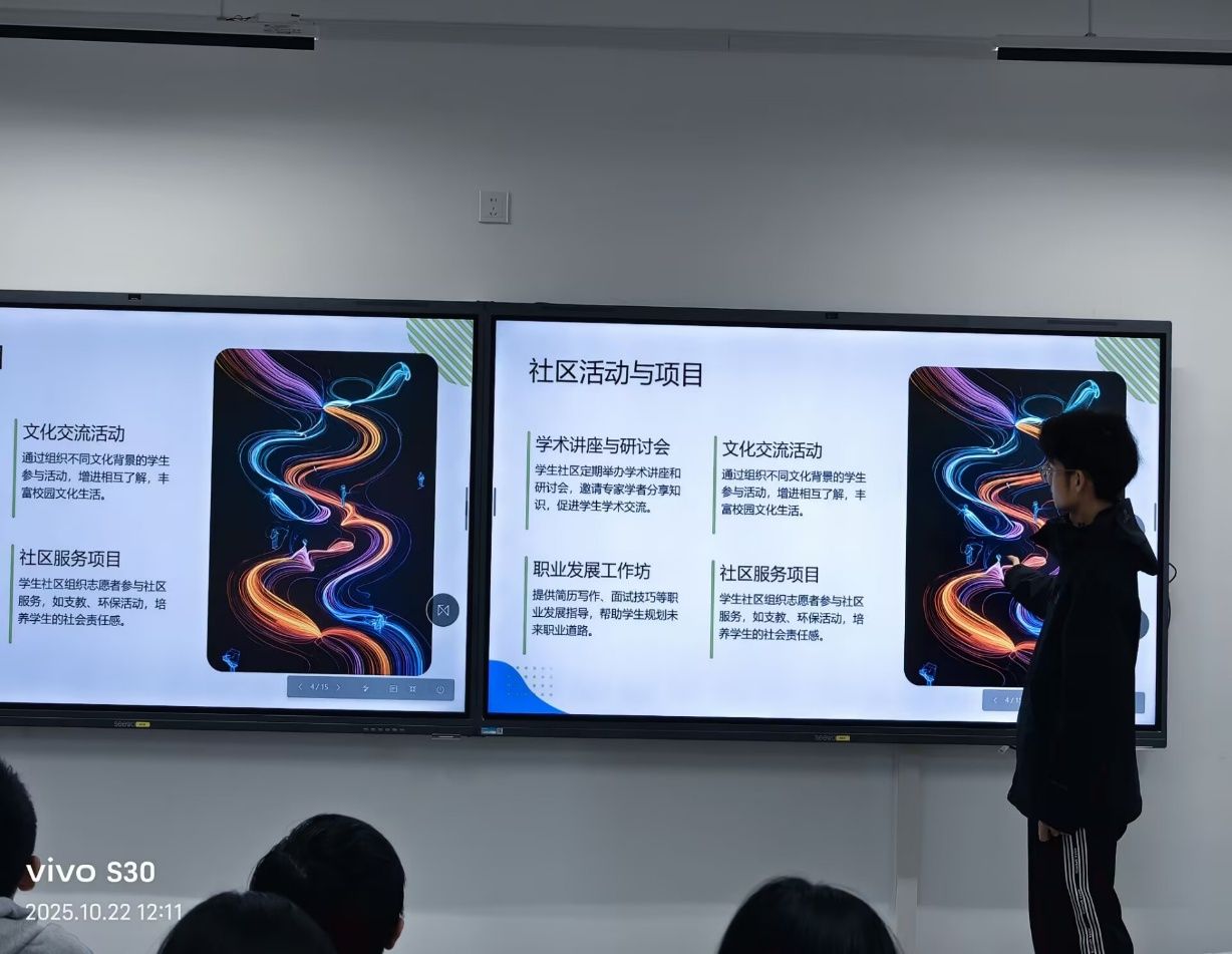 活动中,付瀚雄主要介绍了志愿服务的重要项目。在“社区活动与项目”的核心板块中,四大特色项目尽显志愿生态的丰富维度:文化交流活动打破文化壁垒,让多元背景学生在互动中碰撞思想火花,为校园文化注入国际化活力;社区服务项目深耕支教、环保等领域,引导志愿者以行动扎根社区,将社会责任感熔铸于每一次服务。