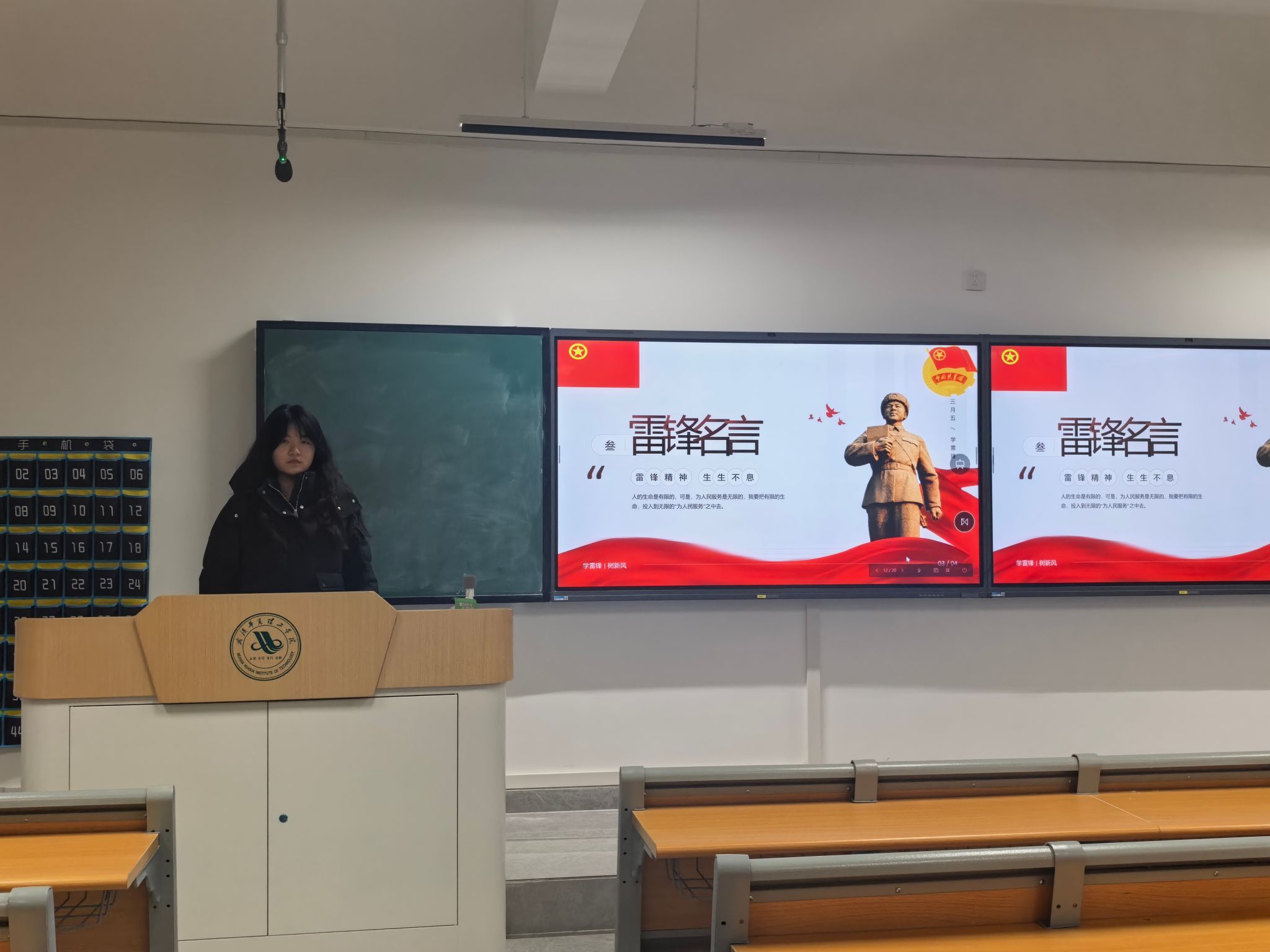 活动伊始,团支书尹麒蓉以精心制作的PPT为载体,从“雷锋生平”“雷锋故事”“雷锋名言”“雷锋精神”四个模块展开宣讲。她首先梳理了雷锋同志从贫苦农家子弟成长为共产主义战士的光辉历程,通过时间轴清晰呈现了雷锋同志的成长轨迹。随后,她讲述了“我叫解放军,就住在中国”“为社会主义建设添砖加瓦”等经典故事,生动诠释了雷锋同志助人为乐、无私奉献的高尚品格。