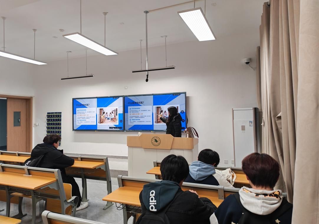 活动开始,部长尹麒蓉在讲解中强调,学生社区是落实立德树人根本任务的“最后一公里”,是连接学校、家庭与社会的桥梁。她详细介绍了新时代学生社区从单一住宿功能向集生活、学习、成长于一体的复合型空间转型的建设背景与核心价值,希望同学们深刻理解社区作为“素质教育第二课堂”和“文化传承重要载体”的重要意义。此外还结合学生社区的生态构成,重点讲解了“一站式”学生社区服务中心的运行模式与朋辈互助机制,鼓励同学们发挥主体作用,积极参与社区的共建共治共享。