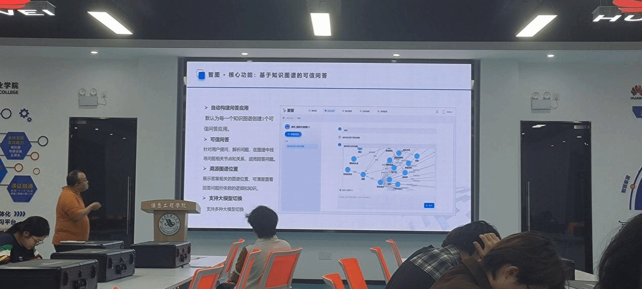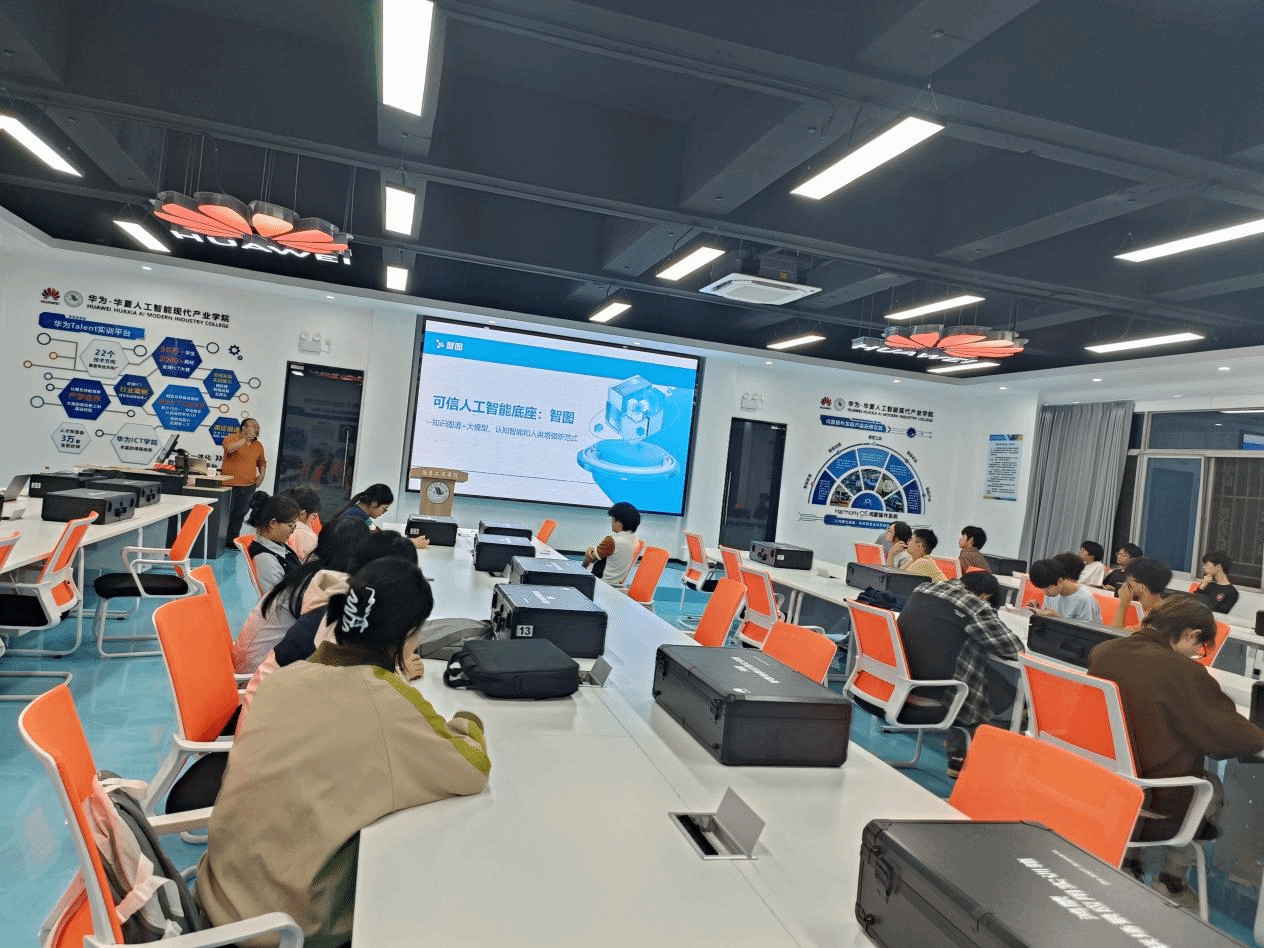 2025年9月25日周四晚上20:00,在412鸿蒙智联万物实验室,智慧教育产学研工作室进行“可信人工智能底座-智图”专家讲座,喻西香老师主讲,苏永红老师、周熠老师参会,张彦豪、李锦鹏、李煜喆、竺灏宇、何升权、张文宇、刘沁杨等计算机、软件工程、人工智能专业33名学生现场参会,人工智能专家徐旭博士、企业合作方铭舒和部分学生线上参会。