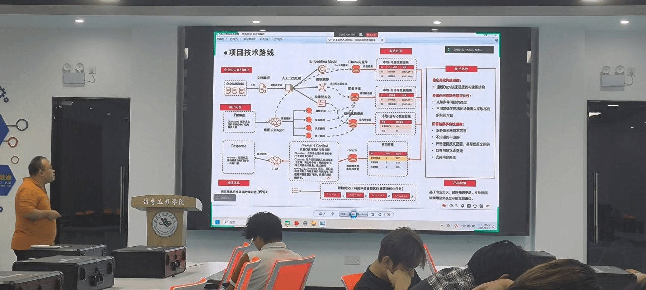 他深入剖析了传统大模型 + 知识库面临的困境,如知识库局限性、实时性问题、整合难度大,以及大模型存在的幻觉、知识更新不及时、知识不足等问题。同时,喻老师着重介绍了硅基智能公司方案——经逻辑校正生成的知识图谱,阐述了大模型与知识图谱相互增强的核心应用,特别是问答系统。他还进一步介绍了拖拽元素的画布工作流应用构建,以及其在智能客服、教育辅助、医疗健康、企业知识管理、政务服务等多个领域的广泛应用。特别是法律知识图谱赋能律所内部管理的案例分享,让我们深刻认识到知识图谱技术在不同行业的巨大潜力。在讲解项目技术路线——构建图谱、多路召回、结果事实性遵循等关键环节时,引发了成员们的强烈共鸣,大家纷纷就这些环节展开热烈讨论,各抒己见,提出了许多富有建设性的想法和建议。这种积极探讨、勇于创新的精神,充分体现了工作室成员的主动性与创造性。