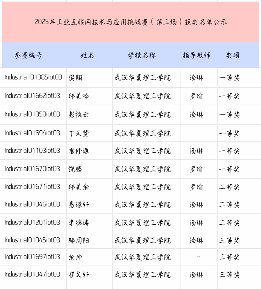 2025年工业互联网技术与应用挑战赛顺利结束。此次赛事由华夏软联工作室主导,在我校首次推行,采用客观题赛制且单次定结果。信息工程学院学子们主动报名参与,12位同学凭借扎实知识储备和出色答题表现,最终斩获佳绩——6人获一等奖,3人获二等奖,3人获三等奖,充分展现了学院学子在工业互联网领域的学习成果与专业素养。