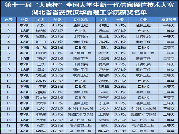 大唐杯是我国信息通信领域最具影响力的大学生科技竞赛之一,旨在推动高校信息通信类专业教育教学改革,提高学生的创新实践能力和综合素质。自创办以来,已成功举办11届。此次比赛吸引了信息工程学院各专业各年级的学生参与,他们得到了由电子与通信工程系骨干教师组成的指导团队的专业辅导。所取得的成绩不仅体现了参赛选手的卓越才华和扎实技能,更彰显了我校信息工程学院在人才培养、实践教学和科技创新等方面的显著成果。是我校师生共同的努力和付出,也体现了学校对学科建设与创新人才培养的高度重视和坚定支持。