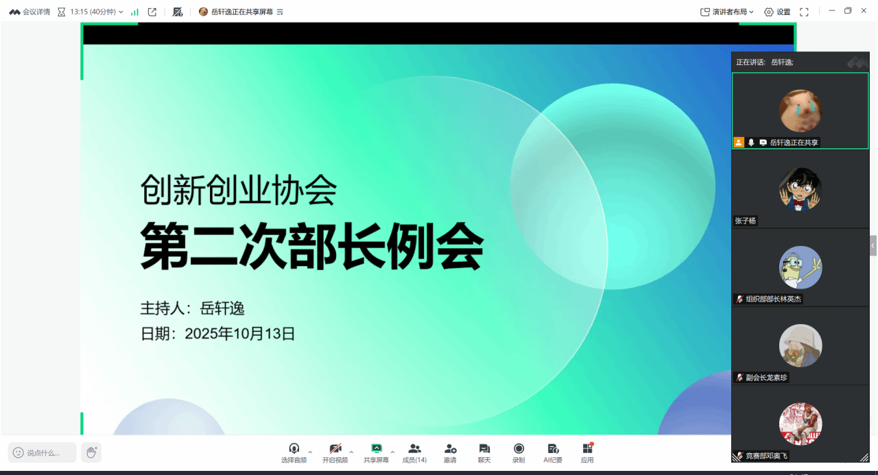 2025年10月13日晚,创新创业协会通过腾讯会议平台成功召开了本学年第二次部长大会。协会下设的组织部、宣传部、文秘部、竞赛部四大核心部门部长及负责人齐聚线上,共同总结前期工作,规划部署下一阶段重点任务,凝聚共识,激发干劲。