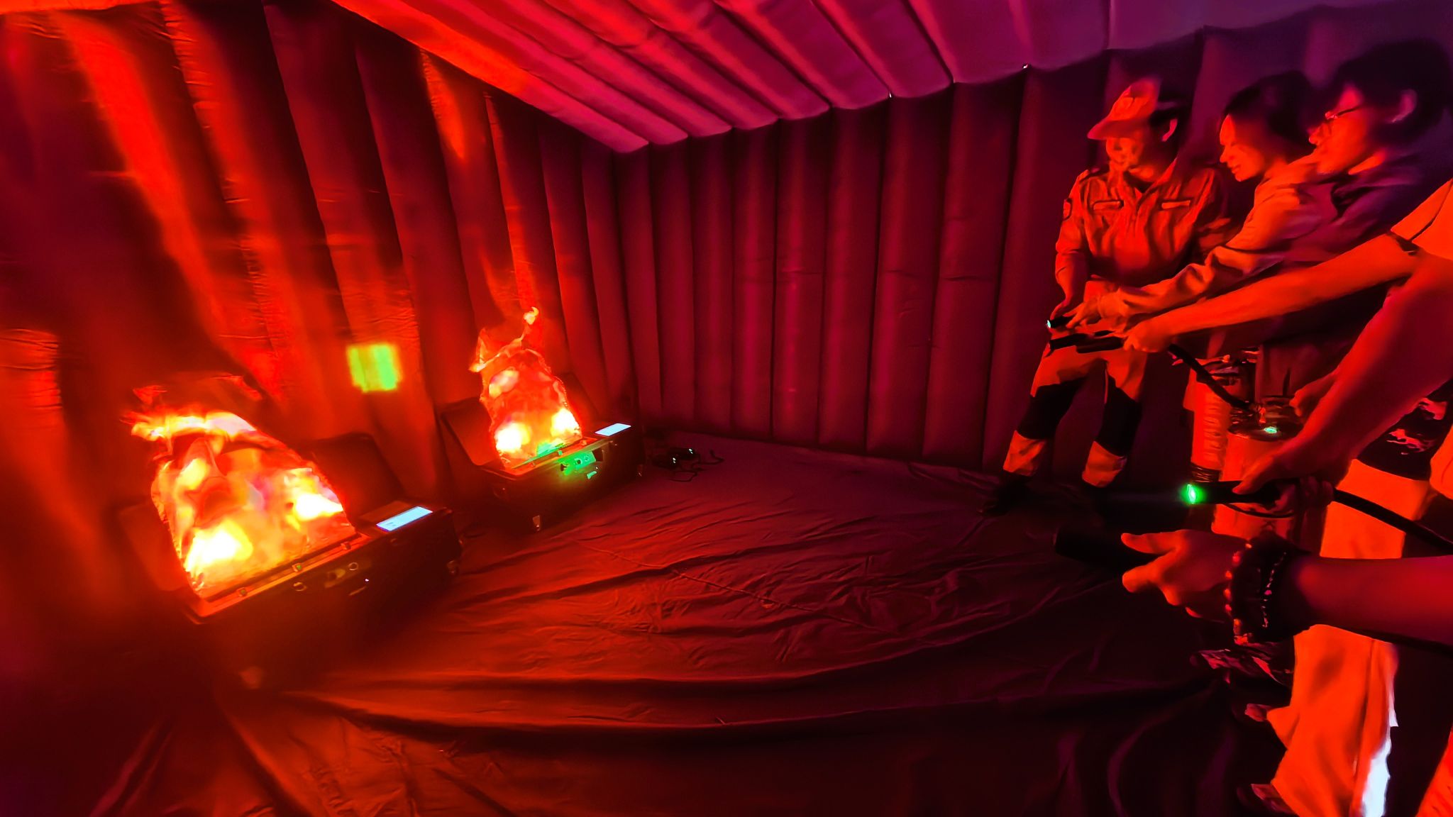 灭火演练结束后,消防中心教官为同学们作消防安全知识培训。消防教官结合三起高校火灾实例,深刻剖析火灾的严重危害,警示师生防患于未然。随后,现场演示了干粉灭火器“提、拔、握、压”四步操作法,并组织学生依次进入火灾模拟逃生帐篷和仿真灭火移动体验馆,亲身体验火场避险逃生和使用灭火器扑灭火灾的技巧。