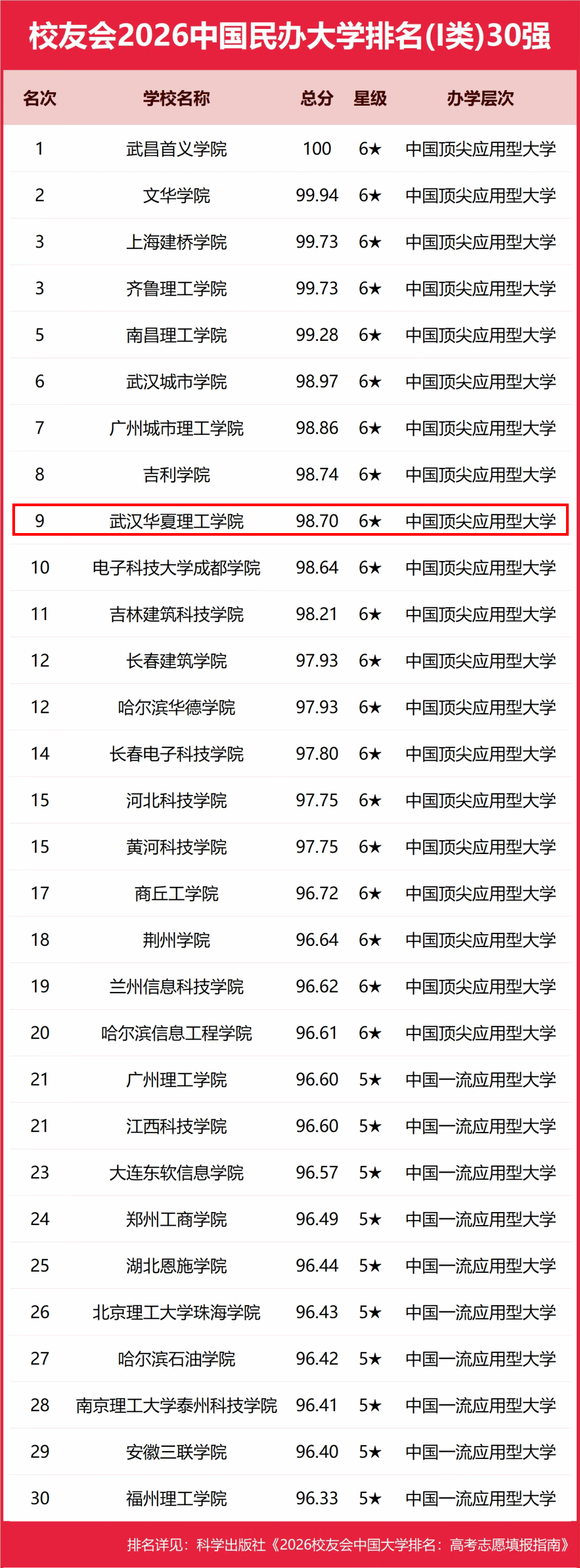 1月12日,艾瑞深校友会发布《校友会2026中国大学排名》。榜单显示,我校位居校友会2025中国民办大学(I类)第九,同时被评为六星级中国顶尖应用型大学。这是我校连续六年蝉联中国校友会中国民办大学(I类)排行榜第九名。