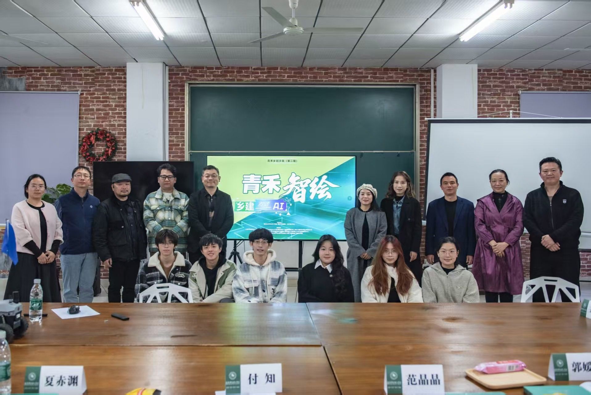 论坛在热烈的讨论氛围中圆满落幕。与会嘉宾包括武汉东湖学院环境设计负责人郭媛媛、武汉华夏理工学院环境设计系主任付知等专家学者,大家就AI技术与乡村建设的深度融合进行了深入交流。与会嘉宾一致认为,AI技术与创意设计的深度融合,将为乡村振兴提供强大助力。活动最后,与会嘉宾合影留念,共同记录下这一富有意义的时刻。