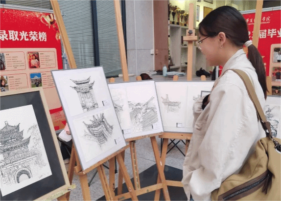 2023年10月30日上午,我校综合楼一楼大厅井然有序地陈列着80余幅画作,给图书馆增添了不少艺术氛围,吸引着教师和学生在厅里驻足观看,原来这些画作全部来自于艺术设计与传媒学院大二学生之手。