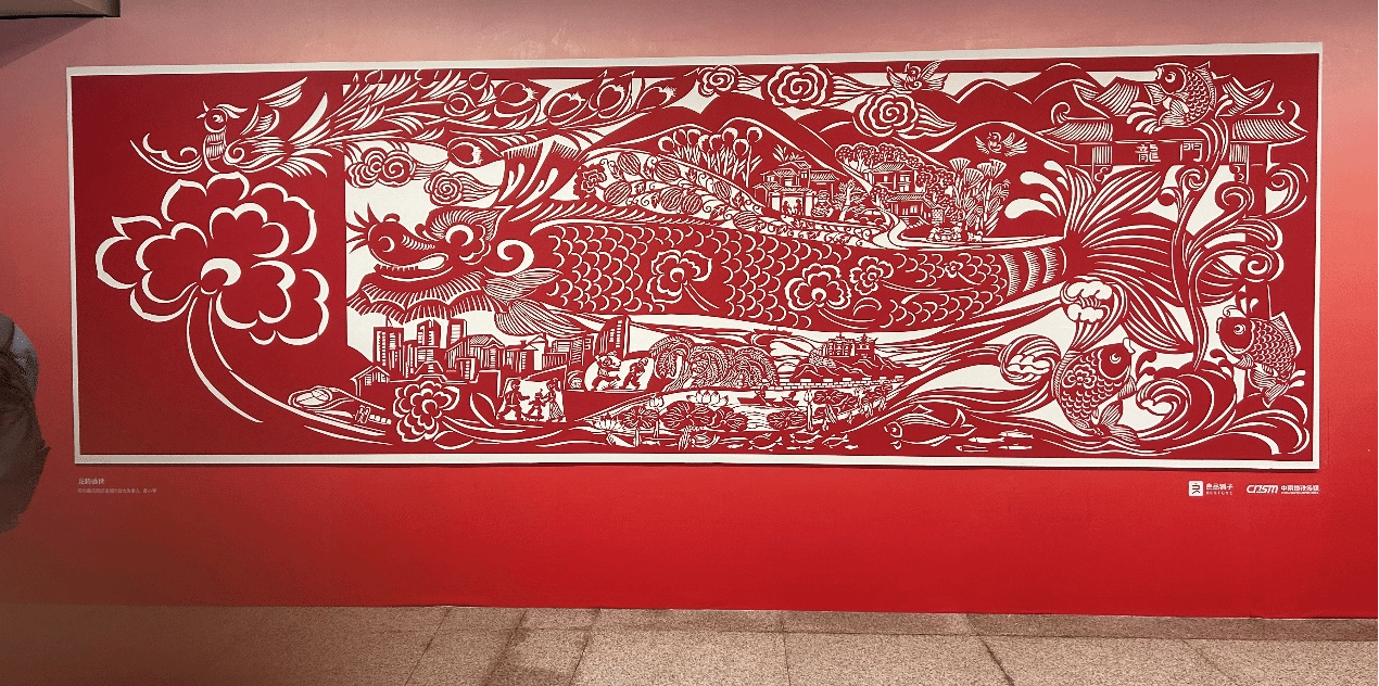 一走进黄浦路地铁站,红火的剪纸作品就映入眼帘,在黄浦路地铁站入口处的空间墙壁和天花板上展出了60余幅剪纸作品。这些剪纸作品均来自湖北省剪纸艺术家之手。在进口右手边,墙壁上展示的是沈松柏老师创作的《锦绣江城(局部)》巨幅剪纸,表现了江城武汉的大江大河、极目楚天的黄鹤楼,细腻的剪纸纹样配合宽广的幅面颇有大武汉之气势,强烈的效果吸引着路过的乘客驻足欣赏、拍照。在这次展览中,来自堵河县剪纸代表性传承人周坤的《龙腾盛世》、《源远流长》也颇具风格,这位90后剪纸传承人尤其擅长脱稿剪纸,这次展出的作品也都是他随心而做,作品以龙为主体,造型饱满、肥美,细节纹样又细腻、修长,将北方剪纸的粗犷和南方剪纸的细腻融合在一起,展示了湖北剪纸独特的风貌。来自湖北鄂州、孝感等地的剪纸传承人作品都各具风格,杨婷婷老师对这些优秀作品用相机一一记录下来,作为学习资料供教学科研使用。