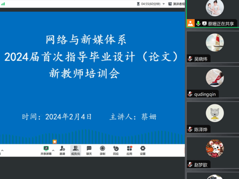 根据学院总体教学计划与进度要求,为加强2024届本科毕业论文(设计)的规范化管理,提高学生毕业论文(设计)质量,2024年2月4日下午,网络与新媒体系蔡姗主任为本系首次指导毕业设计(论文)的新教师们进行了线上培训会。