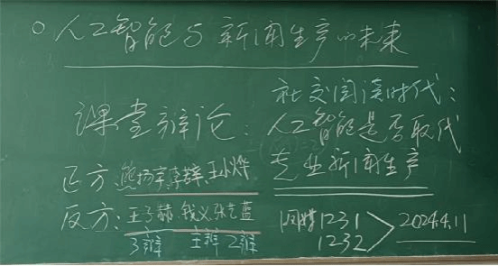 既提高了同学们的批判性思维和论证能力,又加深对于融合新闻课程的认识,这堂课有意思。网媒1231-1232班2024年4月11日的融合新闻课堂上,一场以“人工智能能否取代专业新闻生产”为主题的课堂辩论活动正火热进行中。