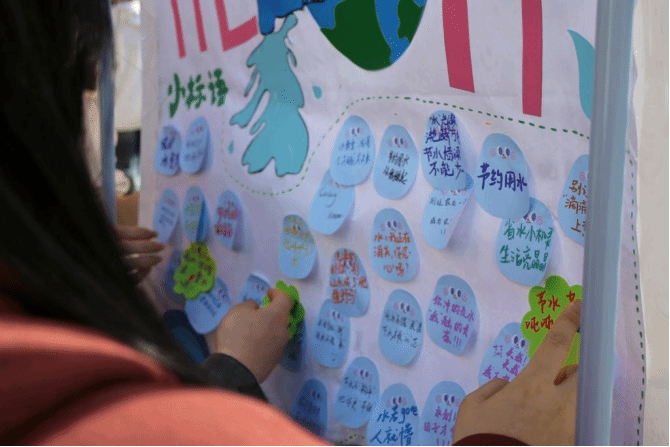“节水金句实验室”环节则充分展示了同学们的创意和才华。他们写下了“水是宝藏,别随意浪”、“省水多一点,幸运多亿点”等朗朗上口、感染力强的标语,彰显了珍惜水资源、保护环境的决心和行动。对于被风吹走的标签,同学们迅速反应,积极追逐并最终找回全部便利贴,默契地再次贴好并用胶带加固,让节水心意稳固留存。