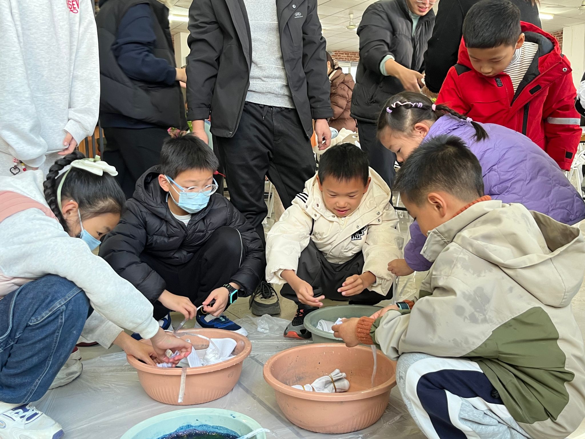 孩子们和家长们纷纷拿起手中的白布,迫不及待地开始尝试。他们小心翼翼地折叠、认真地捆扎,仿佛在雕琢一件珍贵的艺术品。有的孩子手法稚嫩但充满热情,在家长的帮助下逐渐掌握了技巧;有的家庭则默契配合,共同探讨着不同的捆扎方式,现场气氛热烈而温馨。