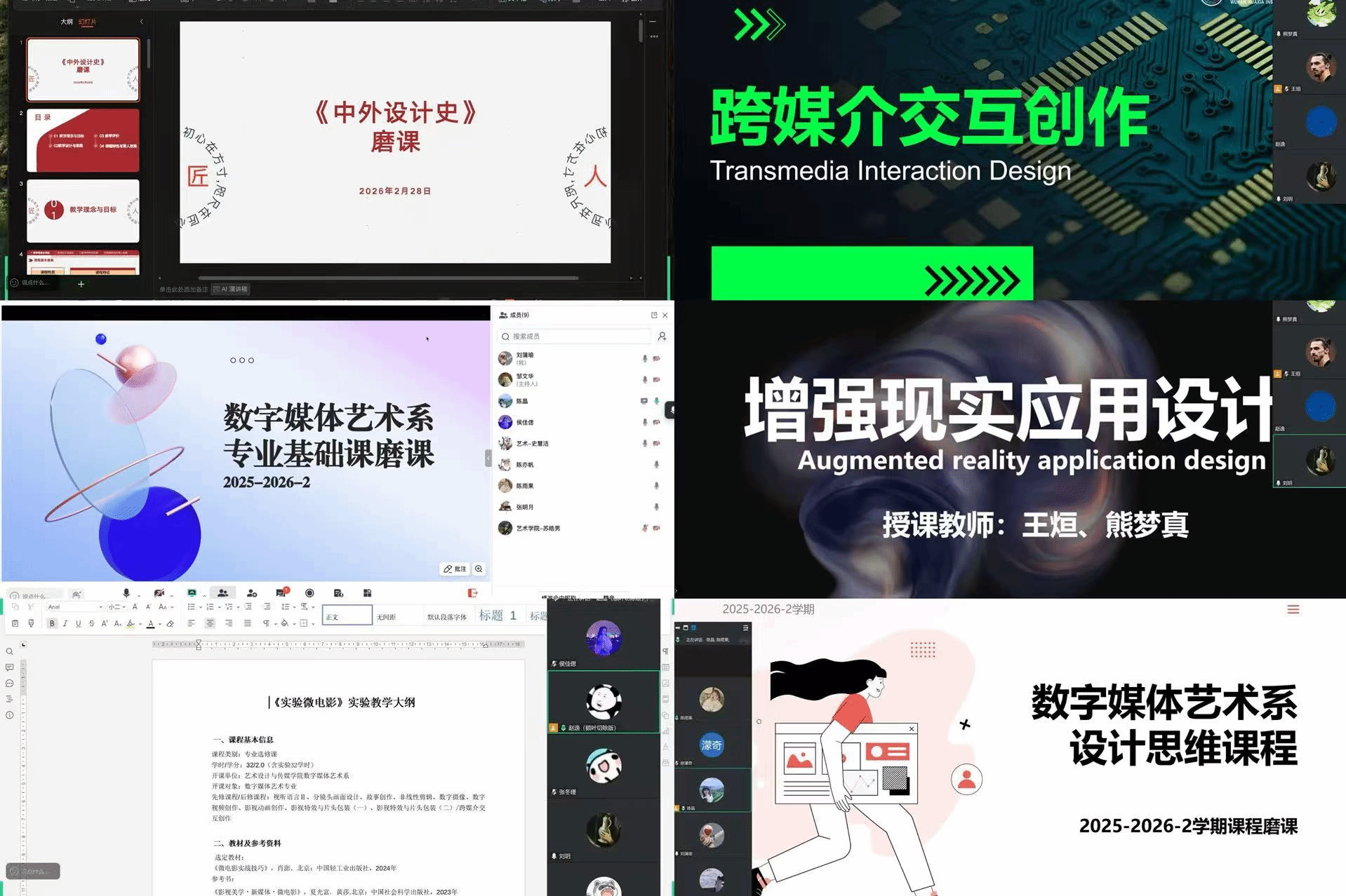 在线上磨课方面,开设的课程涵盖《中外设计史》《设计表现基础Ⅰ(二)》《三维造型基础》《实验微电影》《数字摄像I》《视听语言Ⅲ》《设计思维》《跨媒介交互创作》《增强现实应用设计》等。教师们通过线上平台分享教学大纲、教学案例及多媒体资源,进行模拟授课与互动研讨,充分运用数字化工具优化教学设计,提升线上教学的灵活性与互动性。