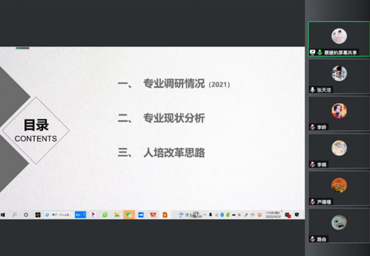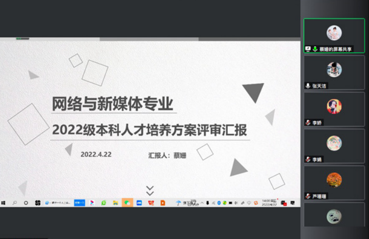 4月22日下午2点,我院召开了网络与新媒体专业2022级本科人才培养方案评审会,会议通过线上形式举行,艺术学院名誉院长路由教授、院长李娇教授、副院长张天洁副教授、教学督导李娟教授、网媒系特聘副教授芦珊珊以及网媒专业负责人蔡姗参会。