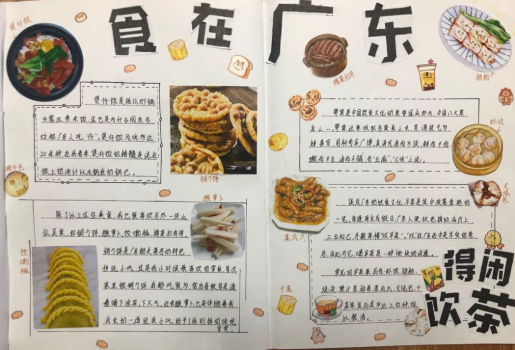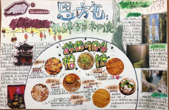 而在大作业——“我和我的家乡”主题剪报上,也有许许多多的同学将家乡的美好呈现了出来。作业的要求是手绘+剪贴,于是许多同学也将自己的“艺术天赋”尽情展示,虽然不是艺术专业,但通过学习和交流加上自己的投入,同学们也做到了图闻并茂,生动有趣。