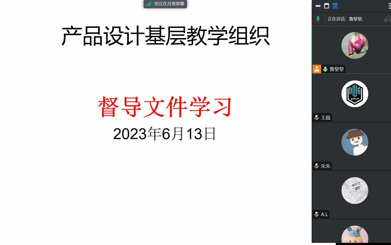 2023年6月13日,产品设计专业全体教师使用腾讯会议开展了有关基层教学组织教学研讨的线上会议。鲁黎黎副主任详细的传达了第九期督导辑要的文件精神,提醒各位老师注意加强教学管理。