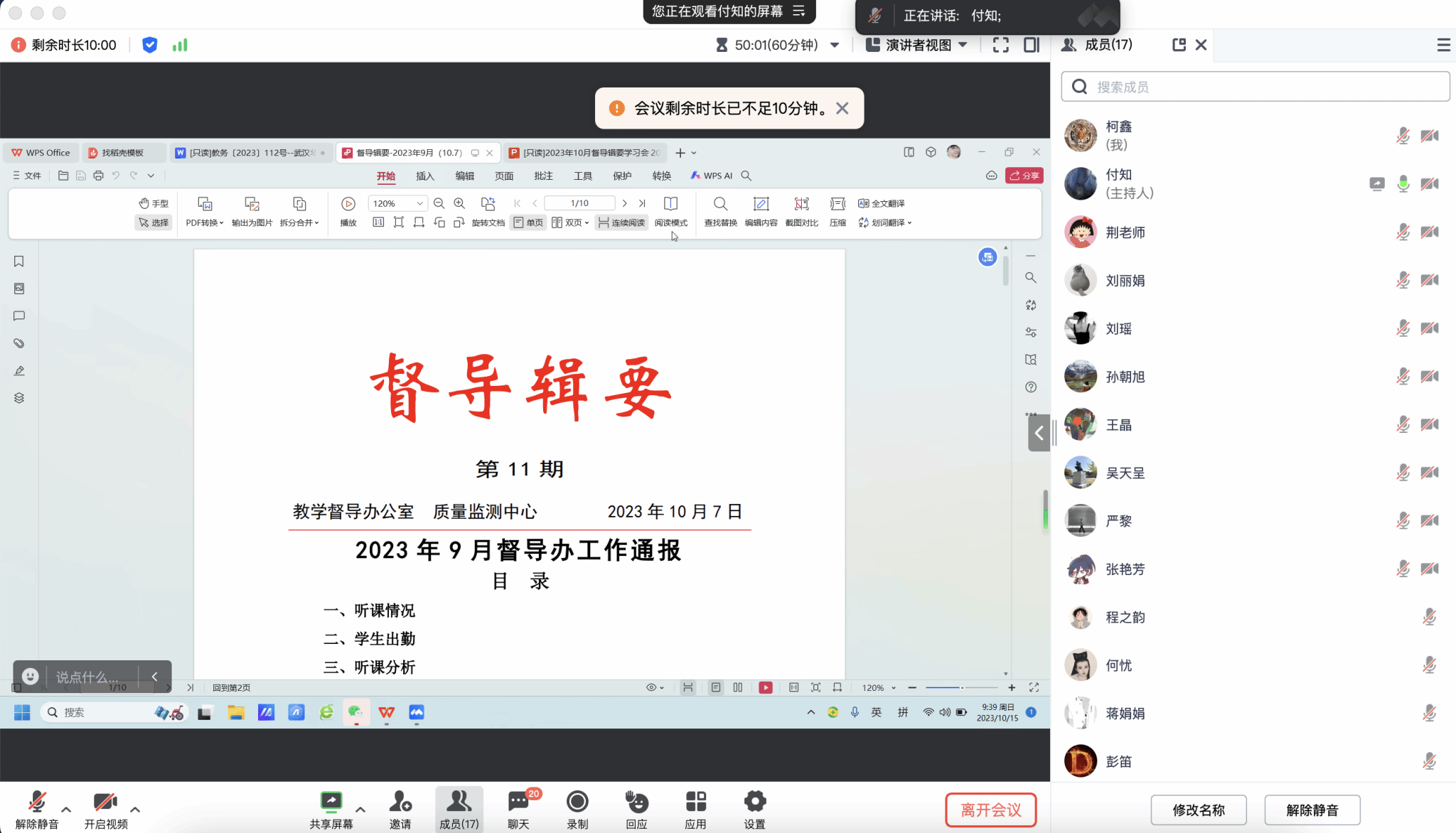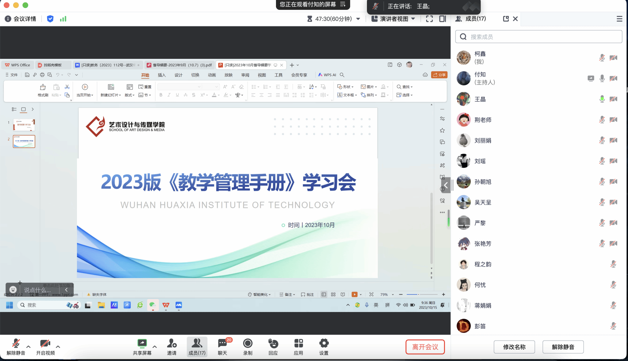 2023年10月15日,艺术设计与传媒学院王晶督导及环境设计系专兼职教师全体成员,以线上形式(腾讯会议)召开了《第11期督导辑要》及《教学管理手册》学习会议。