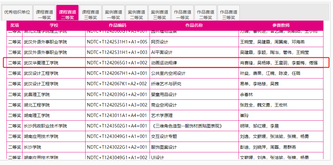 在湖北赛区的在课程赛道中,徐曼老师团队凭借《新媒体运营》课程中的创新的教学理念和实践成果,荣获一等奖,该课程将新媒体与现代营销理念相结合,让学生在实践中感受到新媒体时代的魅力。肖赛锋老师凭借《动画运动规律》课程脱颖而出,荣获二等奖。该课程通过生动的案例和详细的讲解,使学生深入理解了动画运动的基本原理和规律,受到了评委的高度评价。