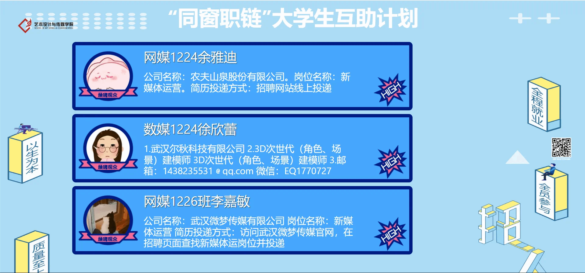 为进一步满足毕业生自我认知、生涯规划、资源累积、创新求变、积极参与、精准指导的需求,围绕“学生自助、朋辈互助、价值共育、发展共建、成果共享”,创新形式解决学生求职就业的难题,我院启动“同窗职链”大学生就业互助计划。