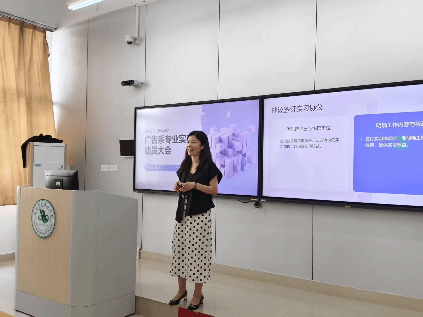 动员大会由黄蓉老师主持,她首先介绍了本次专业实习的整体安排、注意事项及重要意义,强调专业实习是衔接大学课堂学习与行业实践的关键环节,鼓励同学们积极投入企业实战,深入了解广告、传媒、营销及新媒体等领域的前沿动态,是一次检验自身综合能力的绝佳机会。