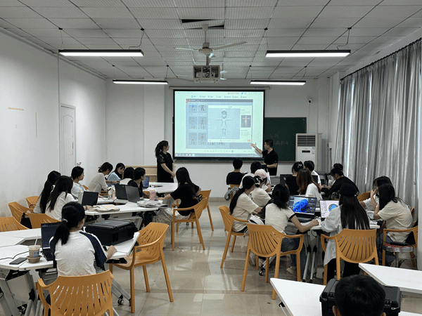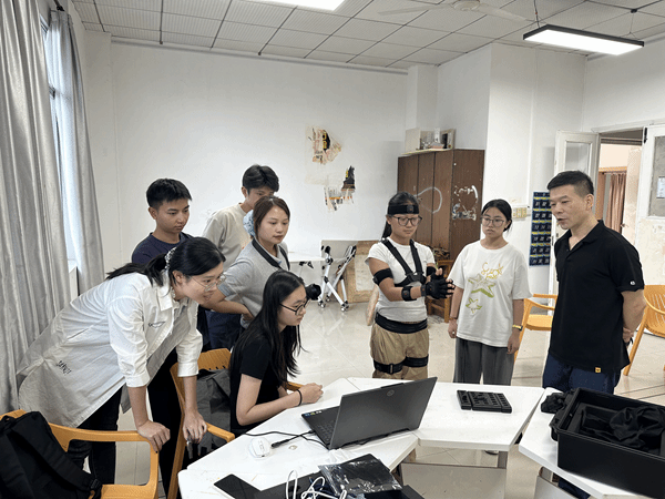 随后,课堂迎来了高潮——学生体验环节。同学们踊跃参加,穿上特制的动捕服装,两位老师穿梭于学生之间,进行一对一指导。当一位同学尝试捕捉一套武术动作时,吴老师从技术角度建议“注意转身的节奏,给系统一个清晰的捕捉时序”;蔡老师则从表现力出发鼓励学生:“想象你真的是那个角色,把情绪也带入进去!”在两位老师的悉心指导下,电脑屏幕上的虚拟角色精准而生动地复刻着学生的每一个动作,这种“化身”为数字角色的新奇体验引得现场惊叹连连。这种“在做中学”的模式极大地激发了学生的创作热情和探究欲望。