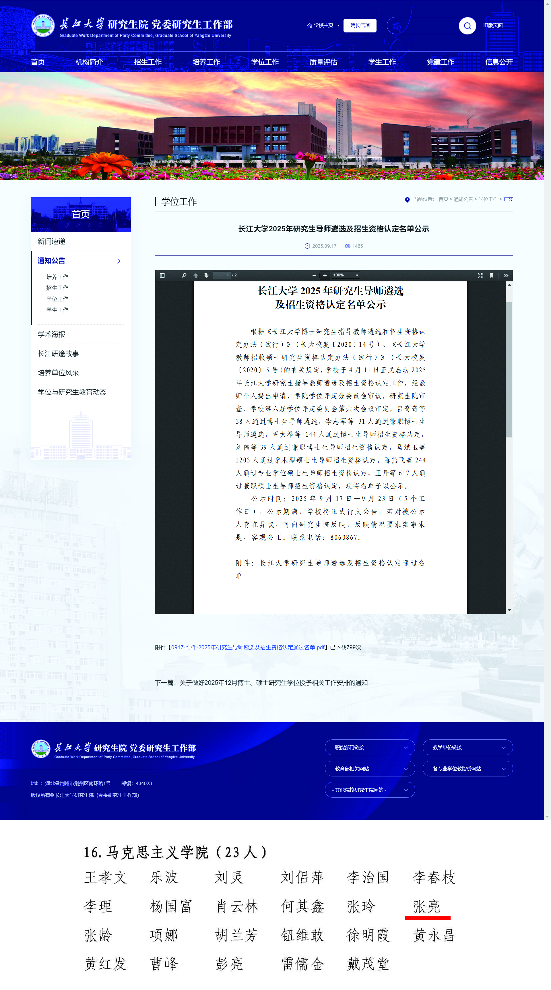近日,长江大学公布了2025年研究生导师遴选及招生资格认定通过名单,院领导张亮教授经层层评选,获批认定独立招生资格。