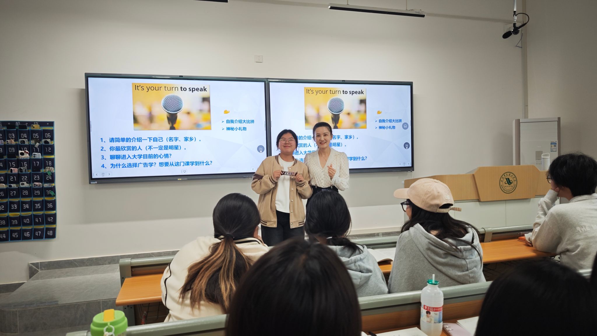 随后,课堂进入了轻松愉快的“破冰”环节。新生们虽略带青涩,但都勇敢地上台,逐一介绍自己的姓名、家乡、欣赏的人以及想从这门课学到的内容。从“觉得广告无处不在”到“想成为创意高手”,一个个质朴而真诚的发言,展现了新生们对未知领域的好奇与憧憬,教室里不时响起会心的笑声与鼓励的掌声。黄蓉老师还精心地为大家准备了小礼物,送给自我介绍让大家印象最深刻的同学。