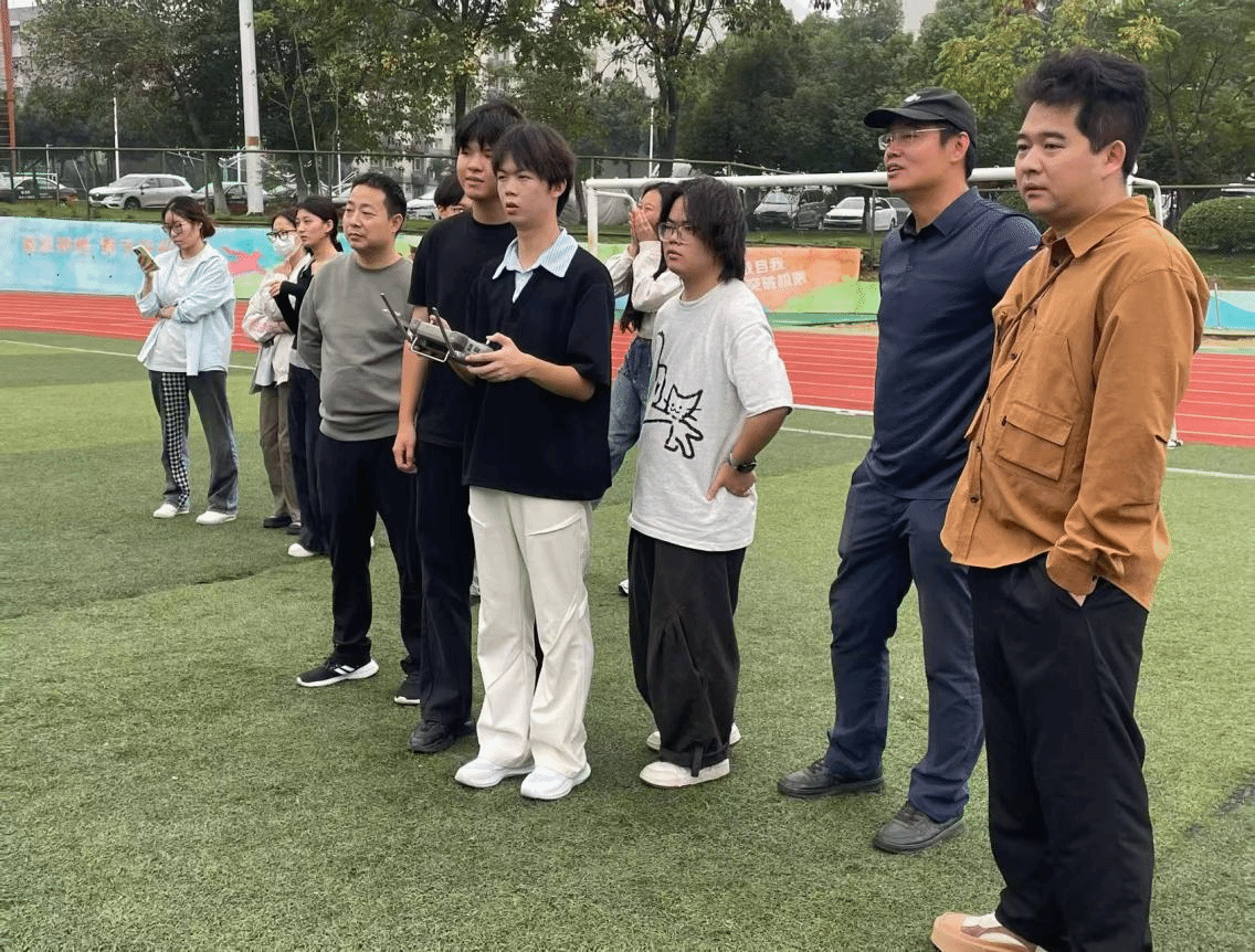 随后,师生们移步校园足球场开展实操体验。企业方带来了质检农用无人机,肖老师首先演示了安全操作规范与基础飞行原理,在简明讲解操控要领后指导学生分组体验。从基础起飞降落到喷洒作业及吊运物品,每位同学都完成了实操训练。“以前只在视频里见过农用无人机,亲手操控才发现其作用这么多!”广告专业学生赵诚智兴奋表示。当他操控无人机升至20米高空并吊运物品时,不禁感叹:“这完全改变了我对无人机的认知。”