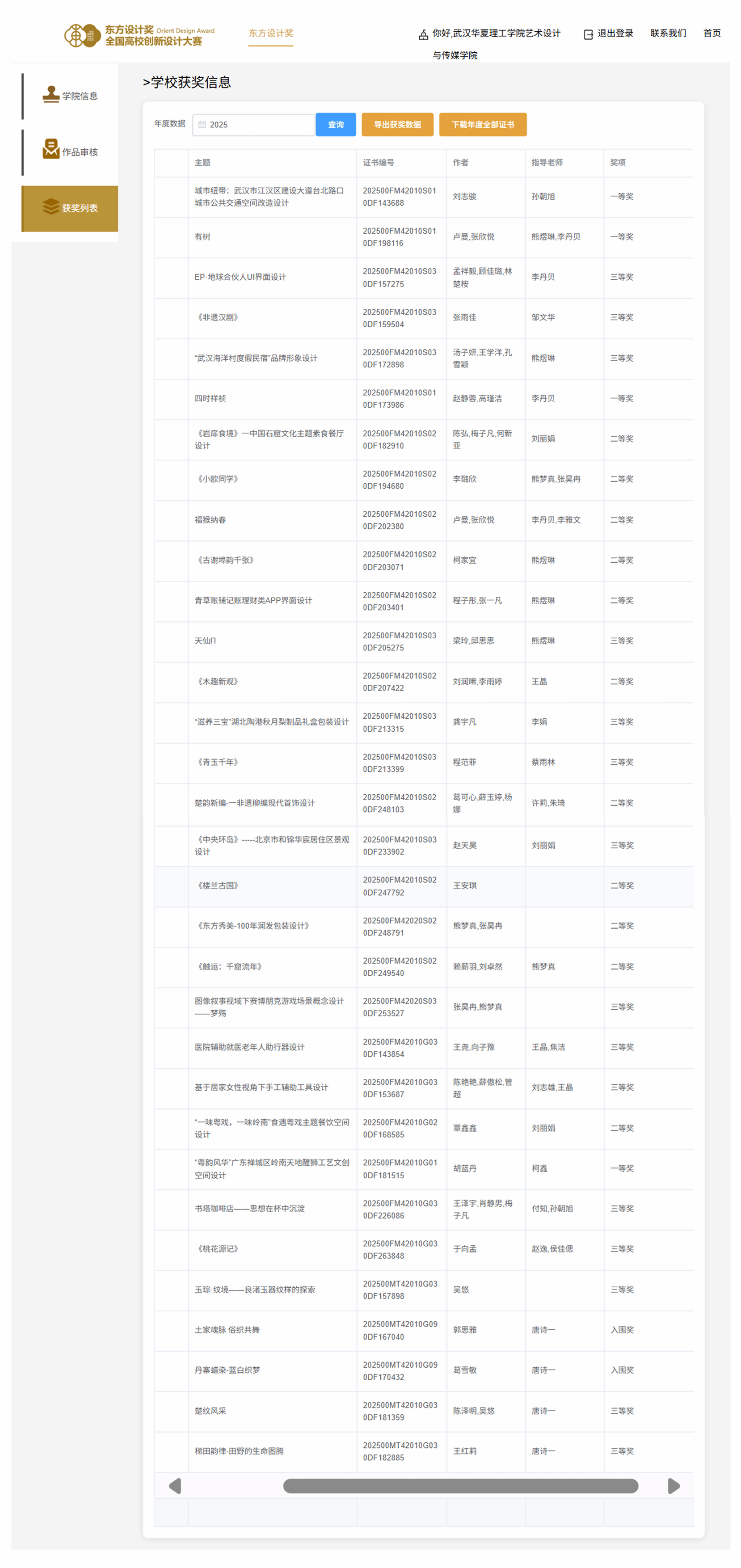参赛作品涵盖视觉传达设计、交互设计、品牌形象、文化创意、空间艺术等多个方向。参赛作品《玉珠·纹境——良活品牌纹样的探索》《脉动汉脉 织汉舞》《丹染古意 造台留梦》《楚致风采》《梯田韵律——田野的生命图腾》等在全国赛中脱颖而出,充分展现我院师生将地域文化与当代设计理念深度融合的创新能力。