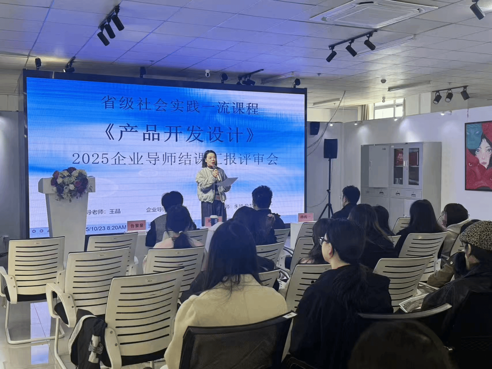 为进一步深化教学改革,展示实践成果,10月23日上午8时,产品设计1231班在艺术馆三楼VR实验室,举办省级社会实践一流课程《产品开发设计》结课评审汇报会。本次会议由课程负责人王晶老师主持,特邀企业导师刘志雄,以及产品系副主任朱琦老师、鲁黎黎老师、孙丙一老师共同担任评审,产设1231班全体同学积极参与并展示丰硕学习成果。
