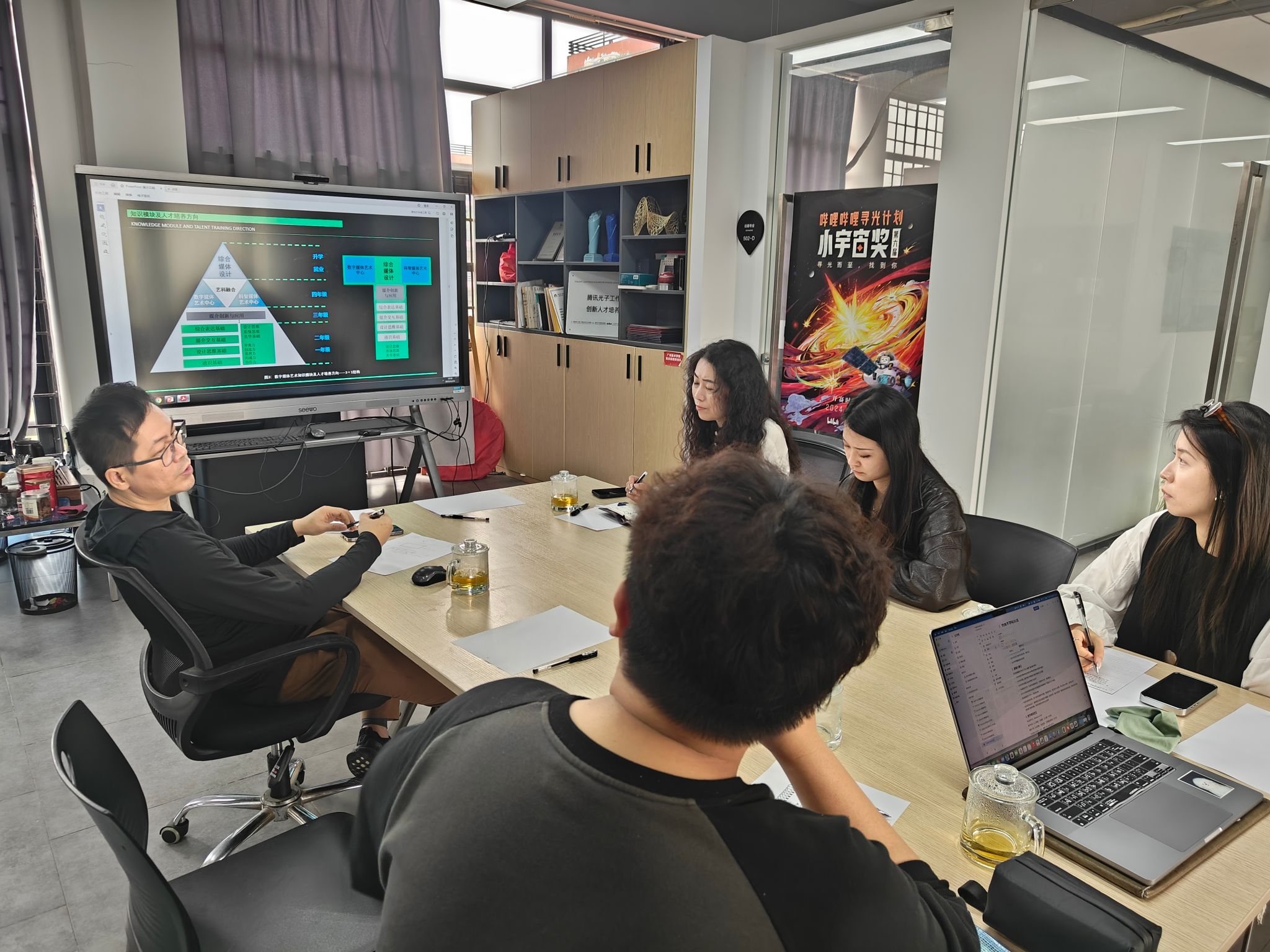 调研团队来到广州大学美术与设计学院,学院教学院长罗洁教授首先系统介绍了学院的基本情况与组织架构,为深入交流奠定了良好基础,并就数媒国际交流、校企协同育人等关键问题与调研团队展开了深入探讨;学院副院长、岭南文化艺术数字实验中心主任、美术与设计实验教学示范中心主任李茂宁副教授结合文旅叙事传播项目,详细分享了如何将实际项目与课程内容有机融合的创新实践;数字媒体艺术系主任周杰副教授则聚焦数媒专业校企课程建设,分享了课程设计方法与实施路径。