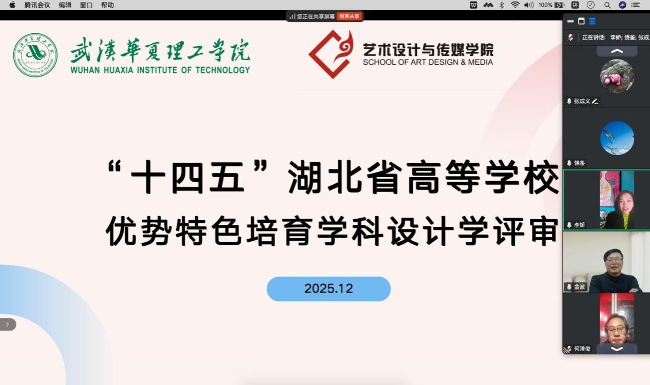 12月12日,武汉华夏理工学院艺术设计与传媒学院组织召开“十四五”湖北省高等学校优势特色培育设计学科评审,邀请湖北工业大学、中国地质大学、青岛大学、湖北第二师范学院的四位教授担任评审专家。学院班子成员、设计学骨干教师参会,会议由艺术设计与传媒学院院长李娇主持。