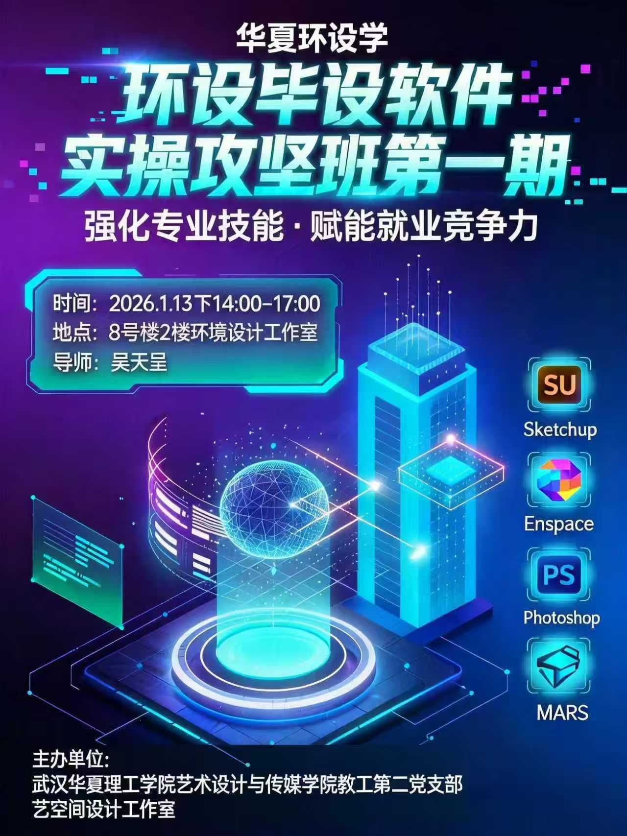 为切实助力毕业生解决毕业设计中的软件操作问题,提升专业实践能力与就业竞争力,武汉华夏理工学院艺术设计与传媒学院环境设计系于2026年1月13日下午14:00至17:00,在8号楼2楼环境设计工作室举办“环设毕设软件实操攻坚班”第一期活动。本次活动由艺术设计与传媒学院教工第二党支部与艺空间设计工作室联合主办,由工作室负责人吴天呈老师担任主讲导师。