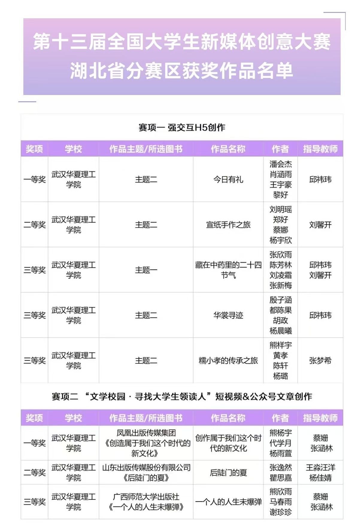 近日,第十三届全国大学生新媒体创意大赛各省分赛区获奖名单陆续揭晓。在湖北省分赛区的激烈角逐中,网络与新媒体专业学生表现优异,凭借出色的创意与扎实的专业能力,在两大核心赛项中斩获多项大奖,展现出该专业在新媒体内容创作与传播领域的强劲实力。