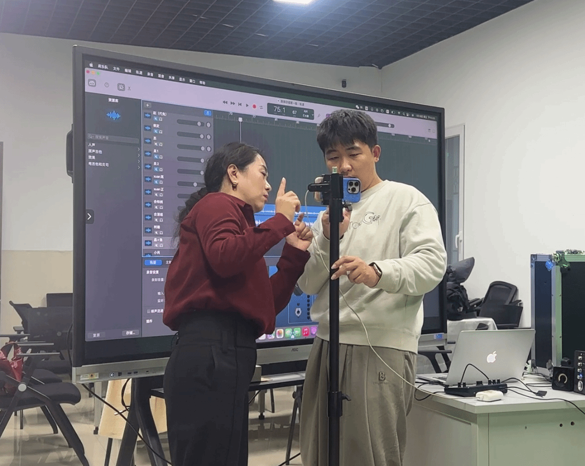 作品的顺利问世,极大得益于教师团队的高效协作与深厚凝聚力。创作初期,团队通过多次团队探讨、与音乐制作人交流创作、编曲经验,确定了音乐创作元素与人文关怀的主题方向。在近两个月的制作周期里,负责作曲、作词、编曲、MIDI制作、演唱、演奏、录音、后期、导演、拍摄、特效剪辑制作等不同任务的教师们,充分利用课余时间,在系内实验室反复打磨。过程中既有灵感的碰撞,也有技术的攻坚,更不乏相互的支持与鼓励。