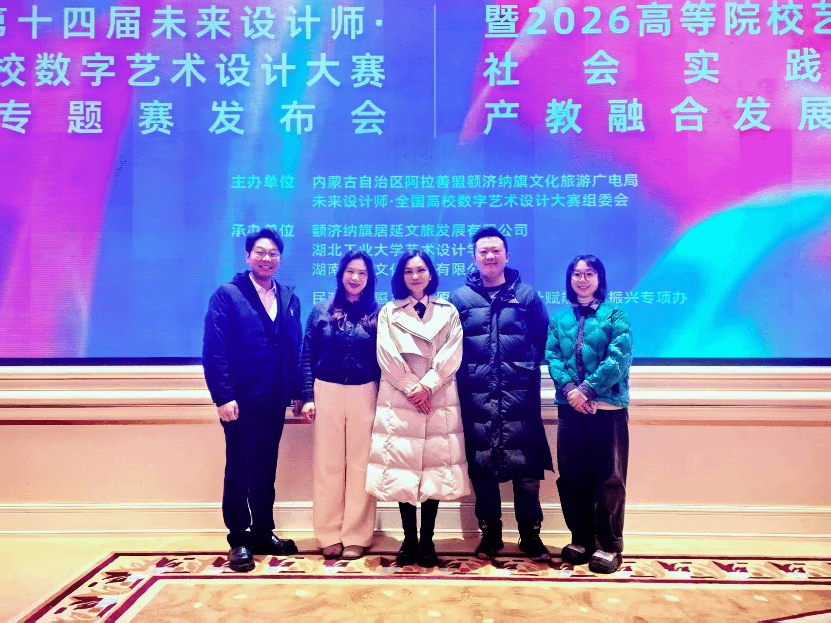 1月22日,由未来设计师大赛组委会联合内蒙古自治区阿拉善盟额济纳旗文化旅游广电局主办的“2026第14届未来设计师・全国高校数字艺术设计大赛文旅专题赛发布暨高等院校艺术设计学科实践教学产教融合研讨会”正式举办。院长李娇带领教师团队受邀参会,与来自全国的高等院校代表、行业专家、地方文旅部门负责人齐聚一堂,共话艺术设计学科实践教学改革与产教融合创新路径。