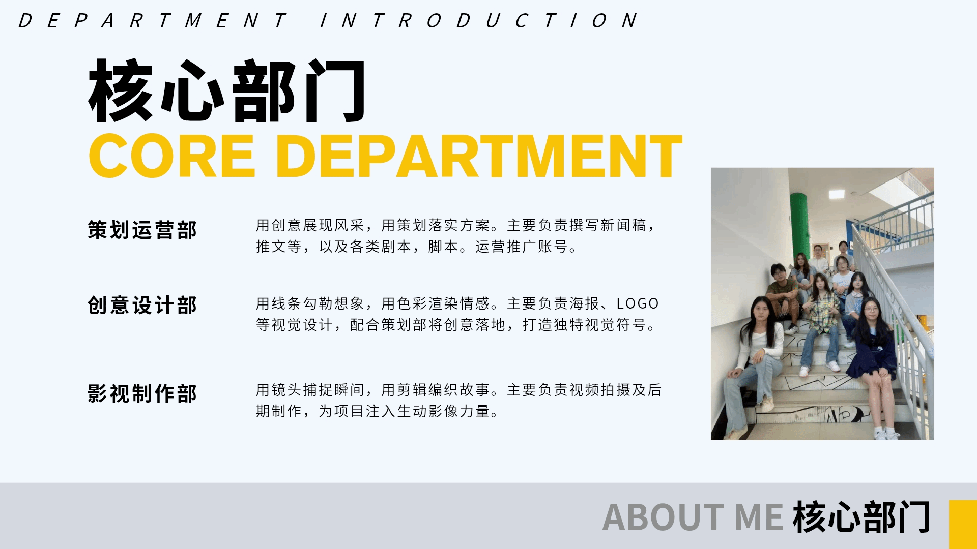 在部门介绍环节,蒋晨部长首先梳理了工作室“策划运营部+创意设计部+影视制作部”三大核心部门架构,明确各部门定位与协作关系。随后,策划运营部负责人韩俞静、创意设计部负责人叶雪晴、影视制作部负责人赵诚智依次登场,通过共享屏幕的方式,详细介绍各部门日常工作内容、核心职责与成员成长路径,全方位展示部门工作特色与发展潜力,让新生们对各部门工作有了深入认知。