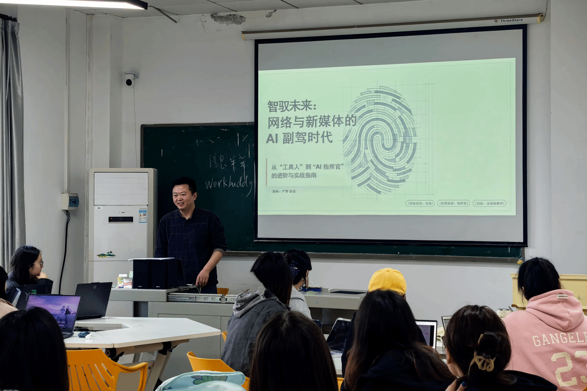 3月30日上午,网络与新媒体专业《新媒体运营》课程在833-1教室开展专题分享,课程组特邀1957设计中心主任严黎老师做客课堂,带来主题为“智驭未来:网络与新媒体的AI副驾时代”的前沿分享。本次专题分享紧扣行业热点,聚焦AI技术与新媒体运营深度融合,为在场学生送上了满满实操干货与行业新知,助力学子紧跟时代潮流,提升专业核心竞争力。