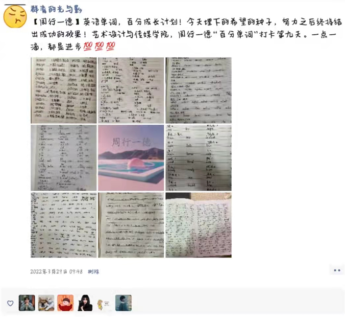 为了帮助大二大三同学保持英语学习劲头,帮助大一同学打牢英语学习基础,艺术设计与传媒学院开展了为期两周的英语打卡活动,每天同学们定时定量的抄写单词,然后将每日成果发布在自己的朋友圈中,活动开展以来成效明显,不仅各班的学风有了明显的提升,更重要的是部分同学坚持抄写单词英语成绩已经有了明显的提升,2020级关同学就表示:去年的英语打卡自己就参加了,每天坚持不懈抄写单词,考四级的时候能感觉到自己的英语水平有了肉眼可见的提升,今年的活动自己还要参加,希望能通过六级。2021级同学表示自己虽然不能去教室上早自习,但是每天对自己的要求不能降低,就算在寝室也要把单词写好。
